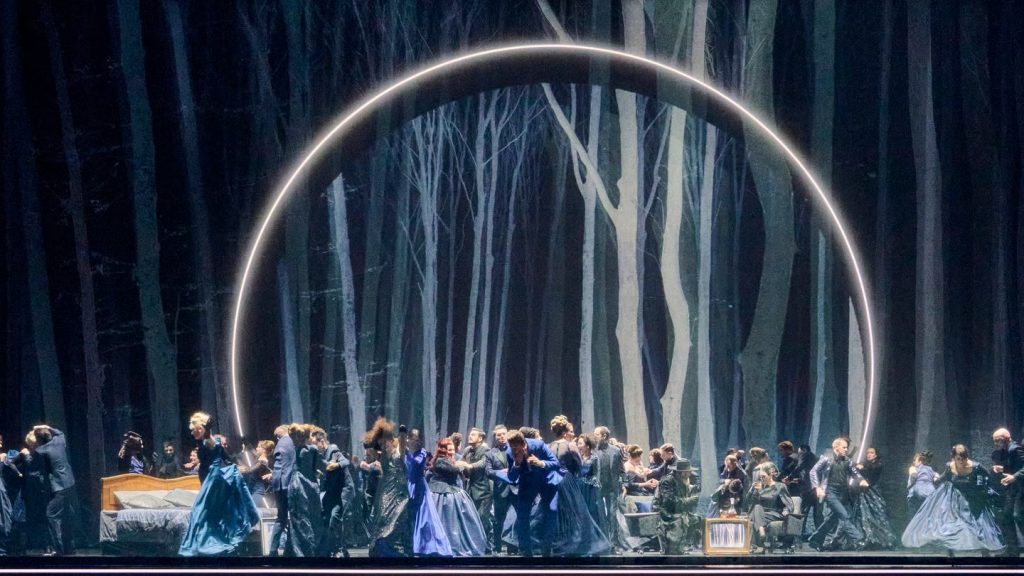 Wagners letzte romantische Oper inszeniert Johannes Erath als Nachtstück. Die Grenzen zwischen Traum und Wirklichkeit sind fließend. Ein in einen Lichtrahmen gefasster dunkler Wald mit hellen Bäumen ist das Setting, in dem er dieses musikalische Märchen spielen lässt (Bühne: Herbert Murauer). Der in den hohen Männerstimmen nicht immer ganz intonationsreine, klangmächtige Tschechische Philharmonische Chor (Einstudierung: Petr Fiala) und Philharmonia Chor Wien (Einstudierung: Walter Zeh, Thomas Böttcher) trägt elegante blaue Abendkleider und schicke schwarze Anzüge (Kostüme: Gesine Völlm).